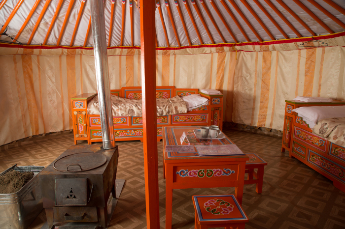 ゲル内にはベッドやテーブル、椅子、薪ストーブが備わっており、快適にお過ごしいただけます。